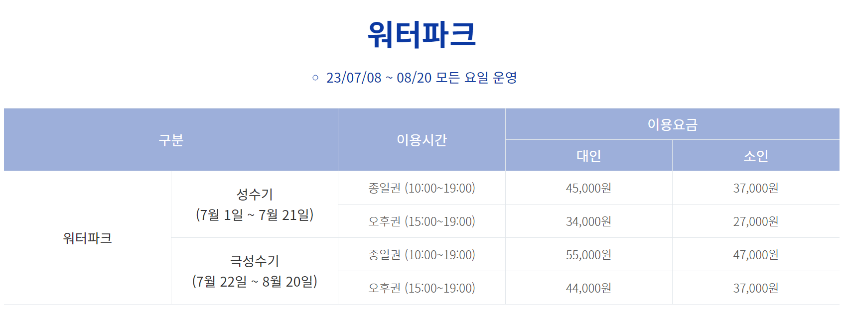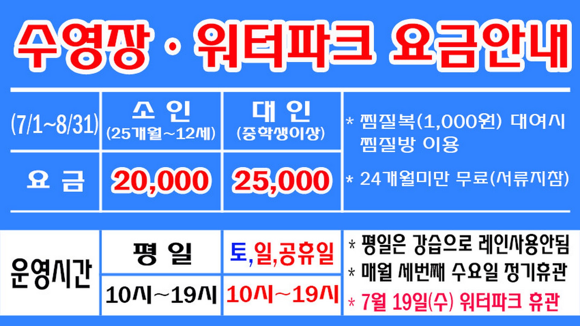 원래 워터파크는 주말, 공휴일만 운영하는데 7/8 ~ 8/20은 매일 운영중이라고 합니다. (찜질방은 운영하지 않습니다.)