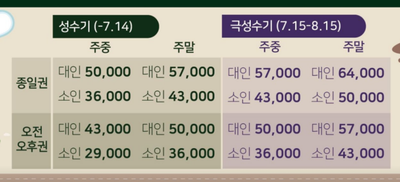 네이버예약이 가장 싸고 현재 극성수기 기준으로, 종일권의 경우 대인 33900원, 소인 25900원에 구매 가능합니다. 오후권을 따로 판매하고 있어 15시부터 짧고 굵게 놀다오겠다! 하면 대인, 소인 동일하게 25900원입니다.